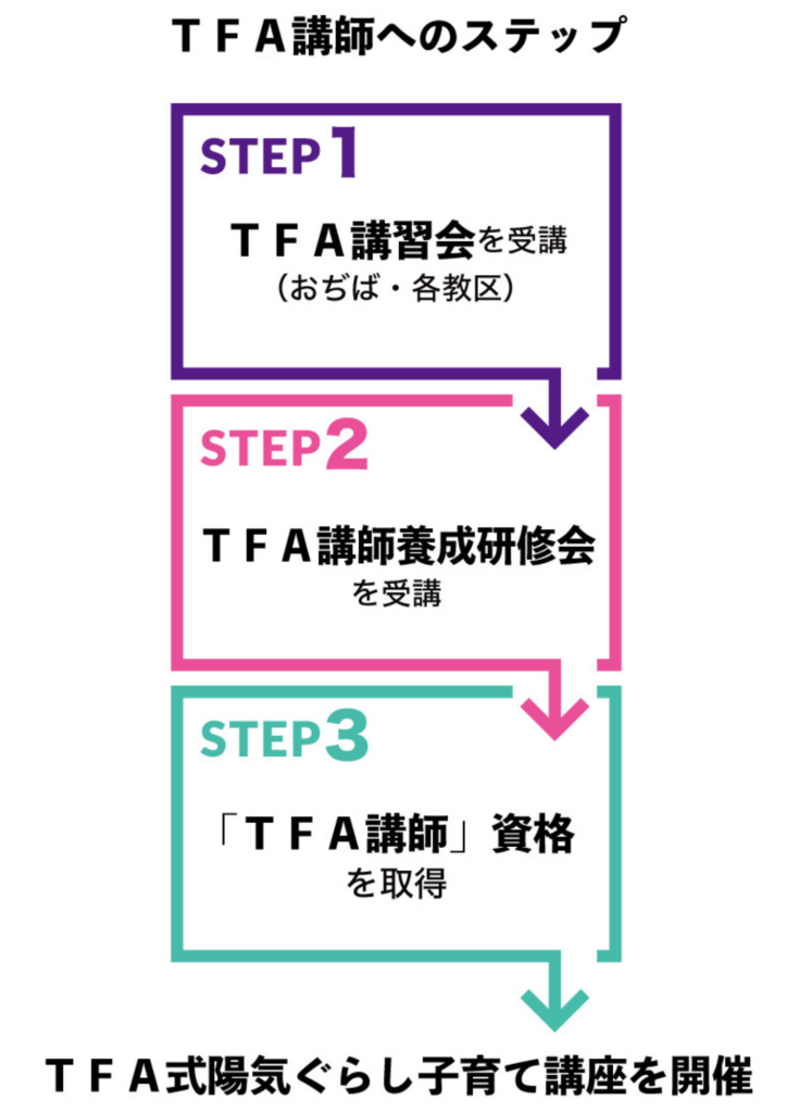 「TFA講習会」とは、TFAの全内容を学べる2日間の講習会で、全課程を修了することで、「TFA講師養成研修会」の受講資格が得られます。