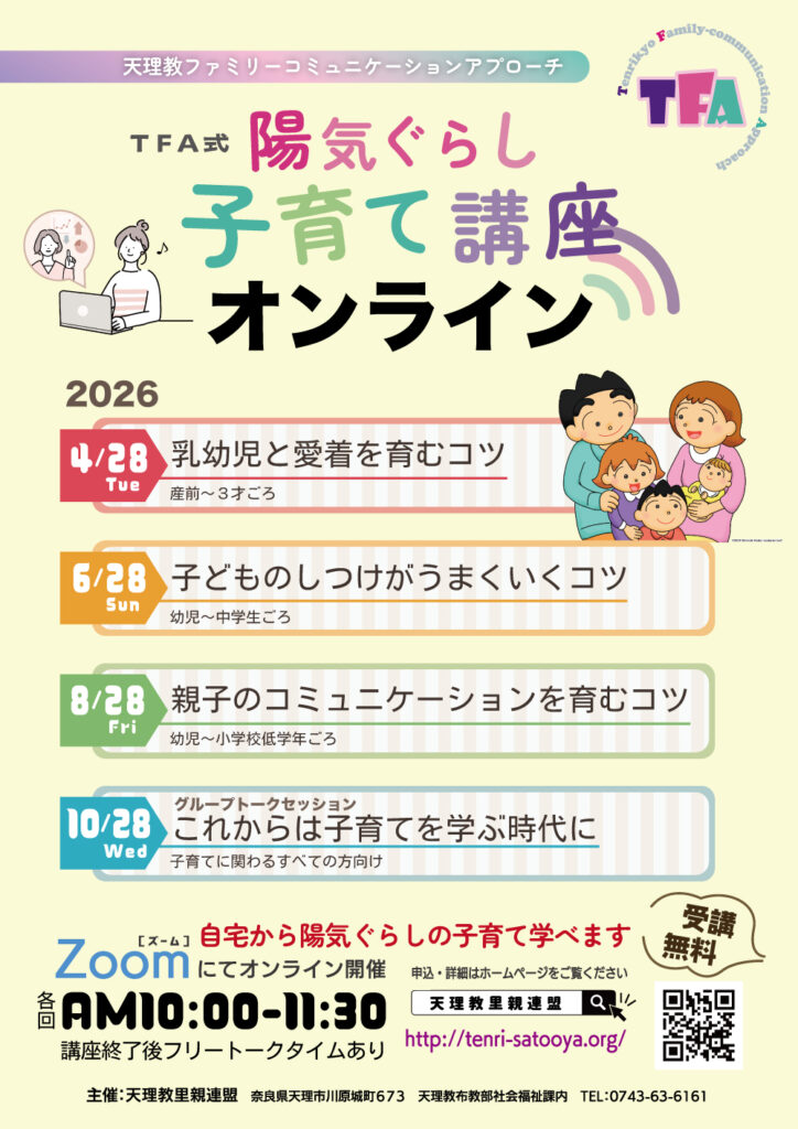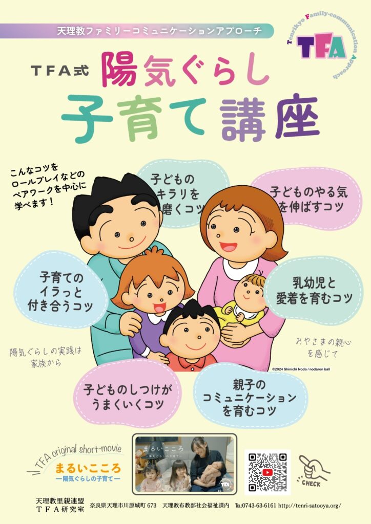 TFAとは、「天理教ファミリーコミュニケーションアプローチ」の頭文字を取った略称で、天理教里親連盟によって考案された、陽気ぐらしを目標とする「子育てアプローチ法」です。
