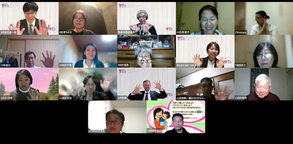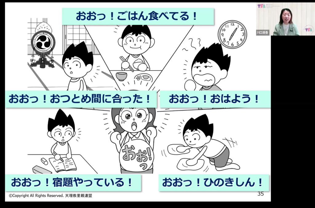 TFAでは、「TFA式 陽気ぐらし子育て講座」という講座形式で、陽気ぐらしの子育てに近づく子育てコミュニケーションの「コツ」を紹介していますが、「すぐ実践できて、効果てき面!」「教祖のお言葉がすっと胸にしみる」「陽気ぐらしの姿がイメージしやすい」という評判が広まり、こども食堂やみちのだい育み塾などの場でも活用されています。